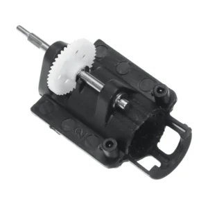 The mechanism that transmits the drive from the engine of a vehicle to its axle. In our case, a tiny motor, a tiny gearbox, some adapters, and a propeller.